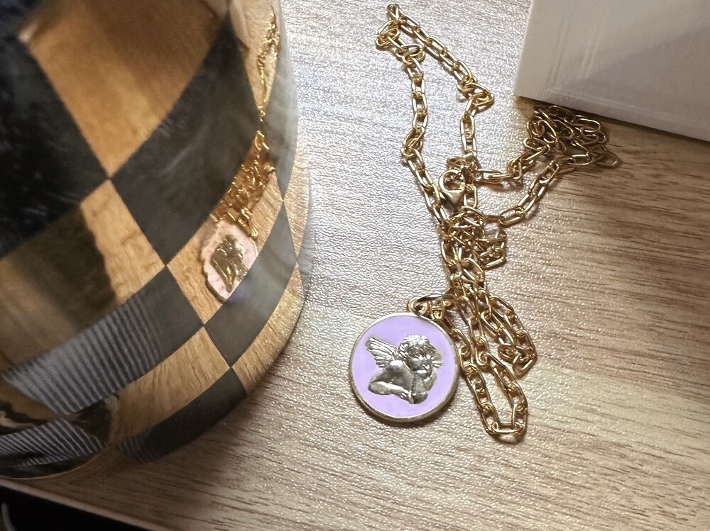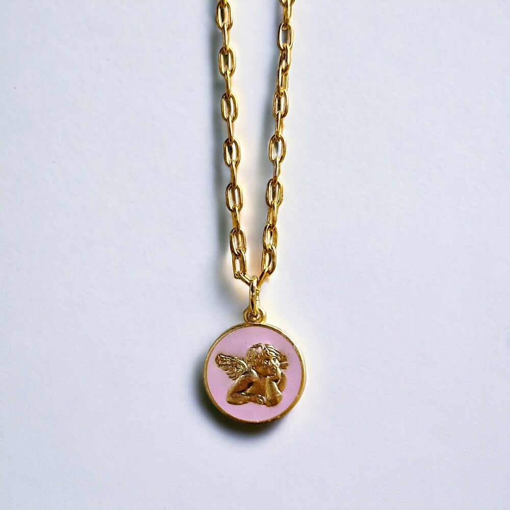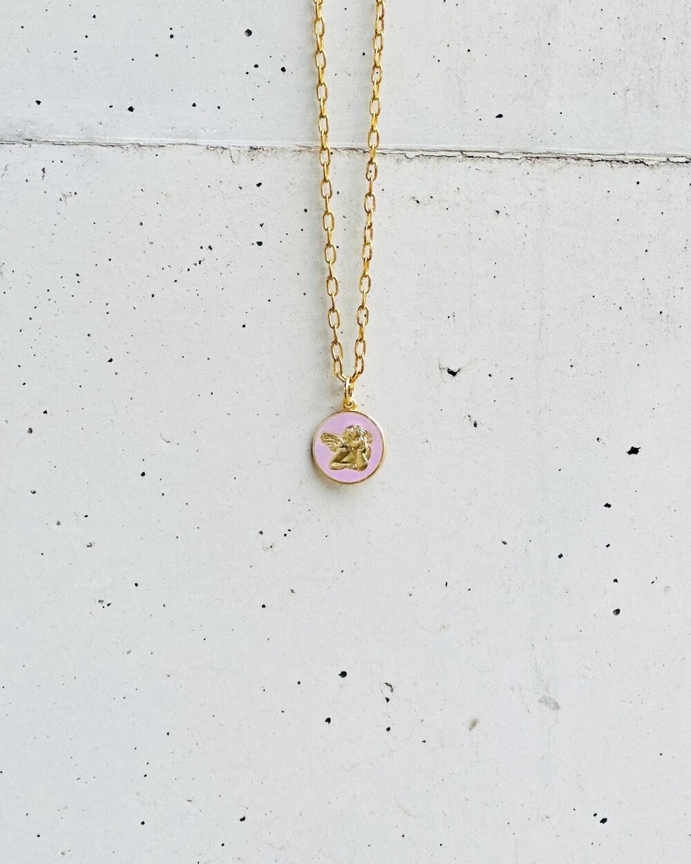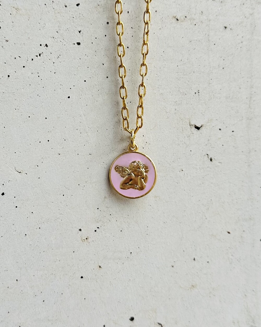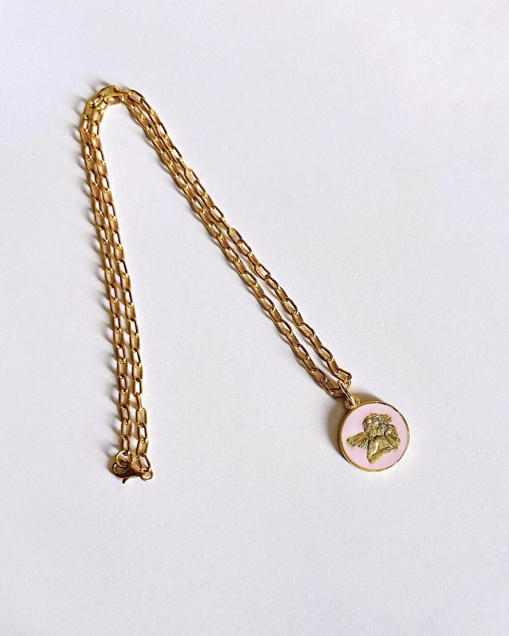 볼드한 써클 모양 팬던트 안에 베이비 핑크 컬러 배경으로 엔젤이 박힌 유니크한 팬던트 입니다.