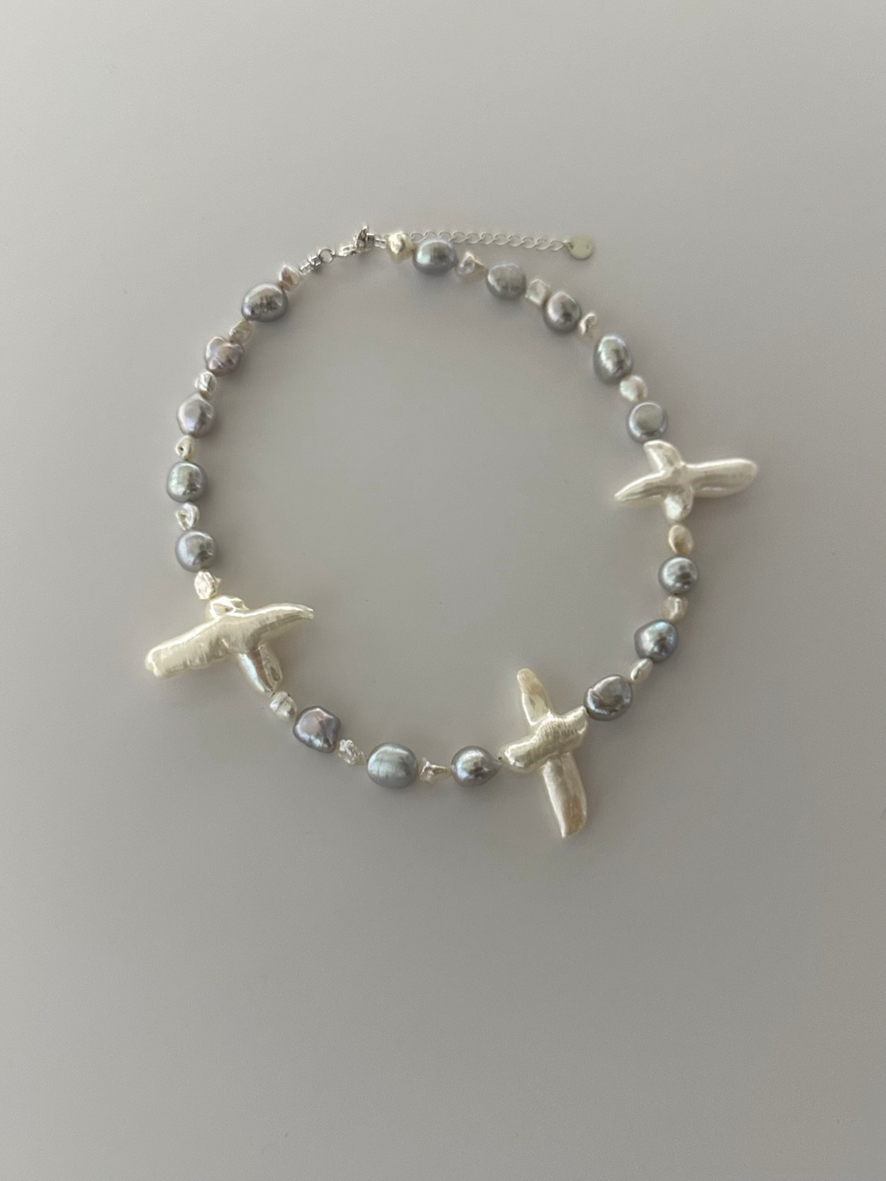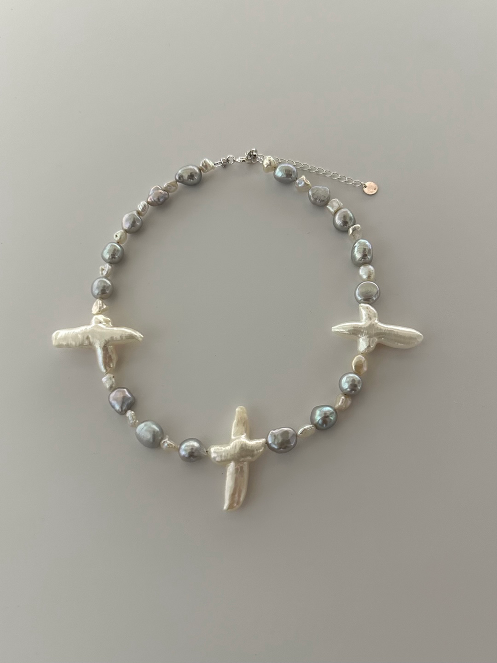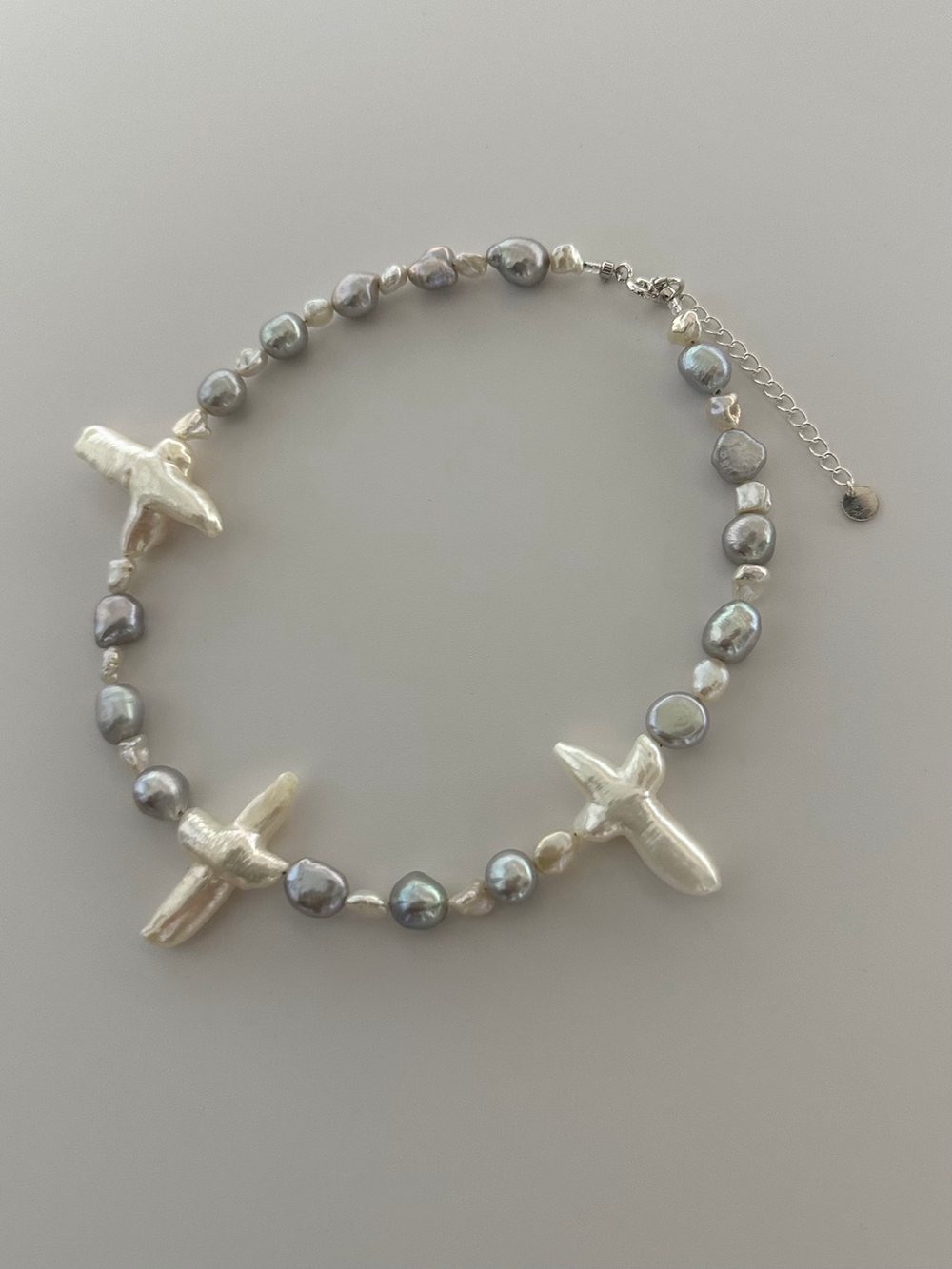 자연이 만들어낸 유일무이한 형태의 바로크 담수 진주와 은은한 광택의 플랫 진주로 완성된 아트피스 네클리스입니다.