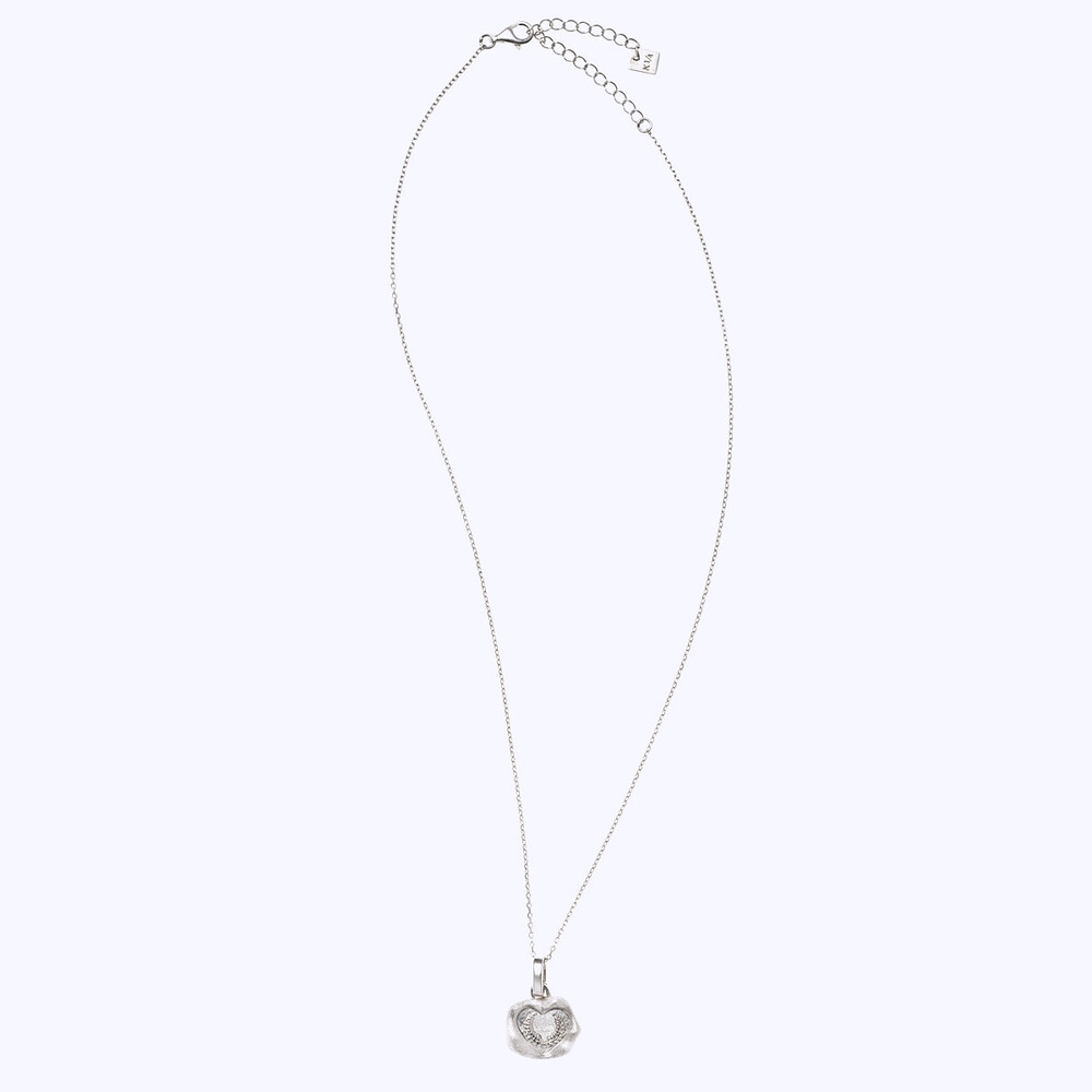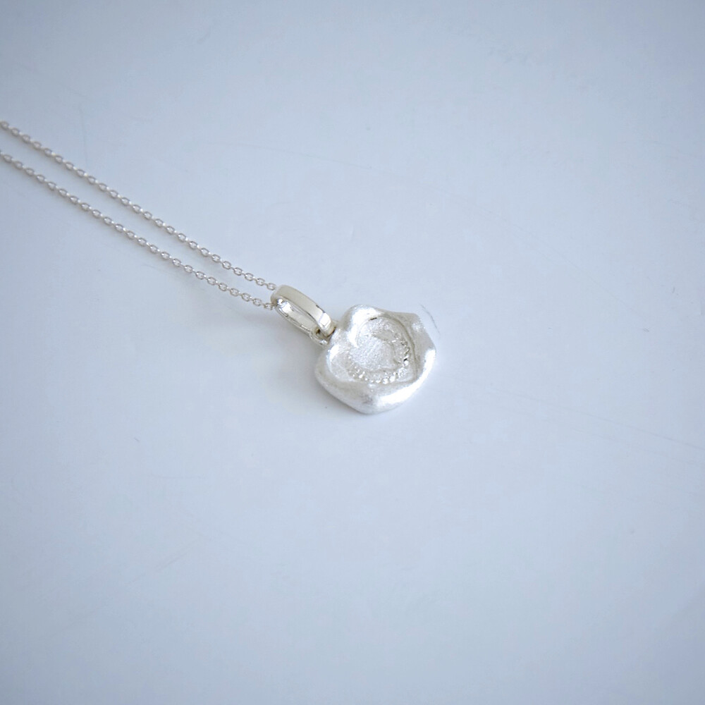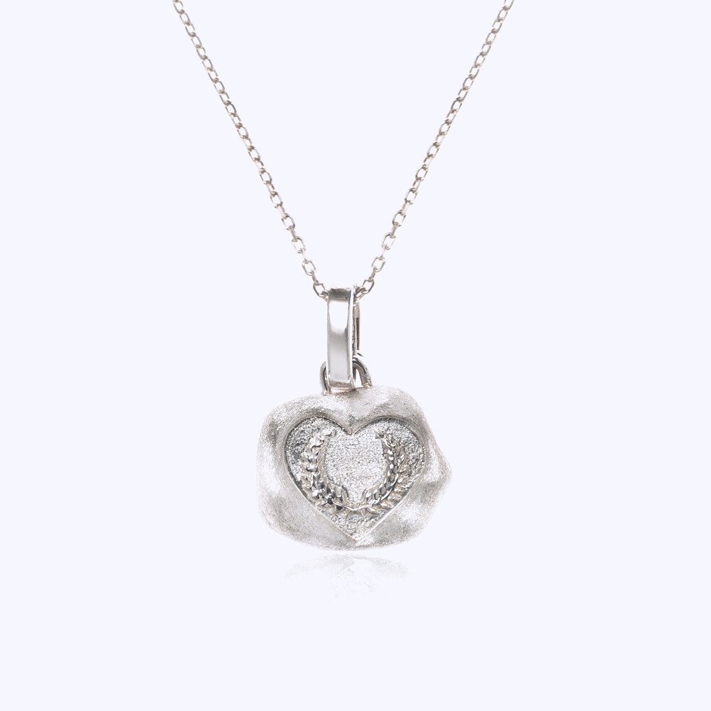 녹아내린 듯한 실루엣의 하트와 인장(seal)에서 영감을 받은 디테일이 결합된 펜던트 네클리스입니다.
