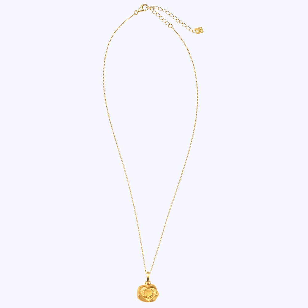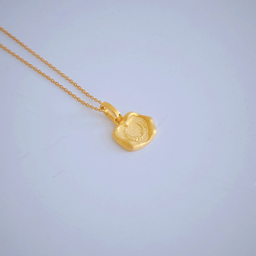녹아내린 듯한 실루엣의 하트와 인장(seal)에서 영감을 받은 디테일이 결합된 펜던트 네클리스입니다.
