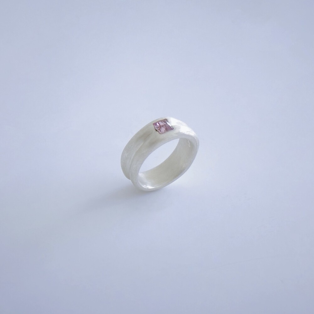 표면을 매트하게 마감한 링 위에 사각 스와로브스키 스톤을 얹은 메이드 투 오더 링입니다.